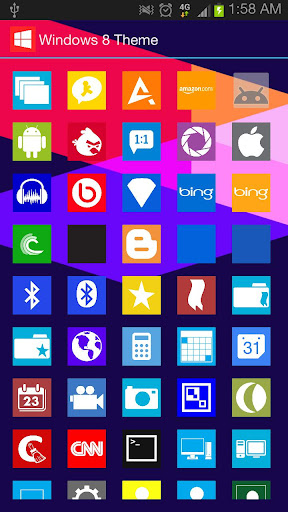 Checkout the official Windows 8 Launcher Theme, this features a HUGE set of metro style Windows 8 icons. There is around 400 ICONS, There is 18 HD Wallpaper (1920×1200) and Custom Apex Icons and Drawables. You wont have to worry if there is app that custom have a custom icon, There also even 18 Icon Backgrounds to make ALL your icons have the new Windows 8 Metro Style.